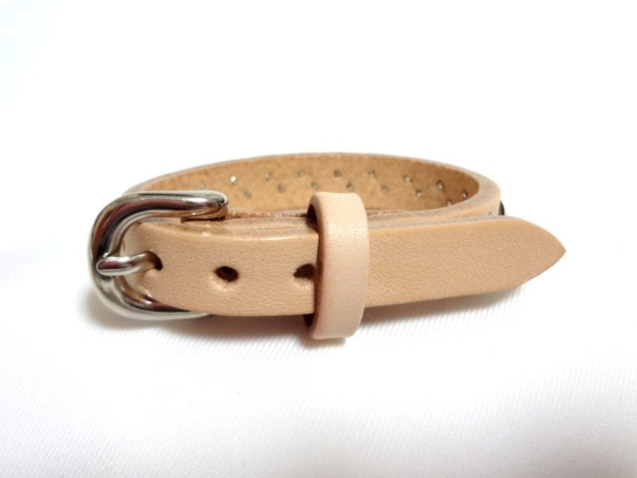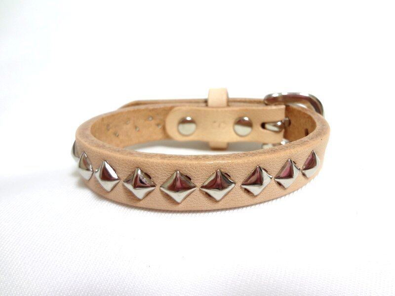 素材はサドルレザー、スタッズは全てスタンダードリベット社の2つ爪の物を使用し、1発ずつ手打ちにて丁寧に爪を折り曲げて打ち込んでおります。